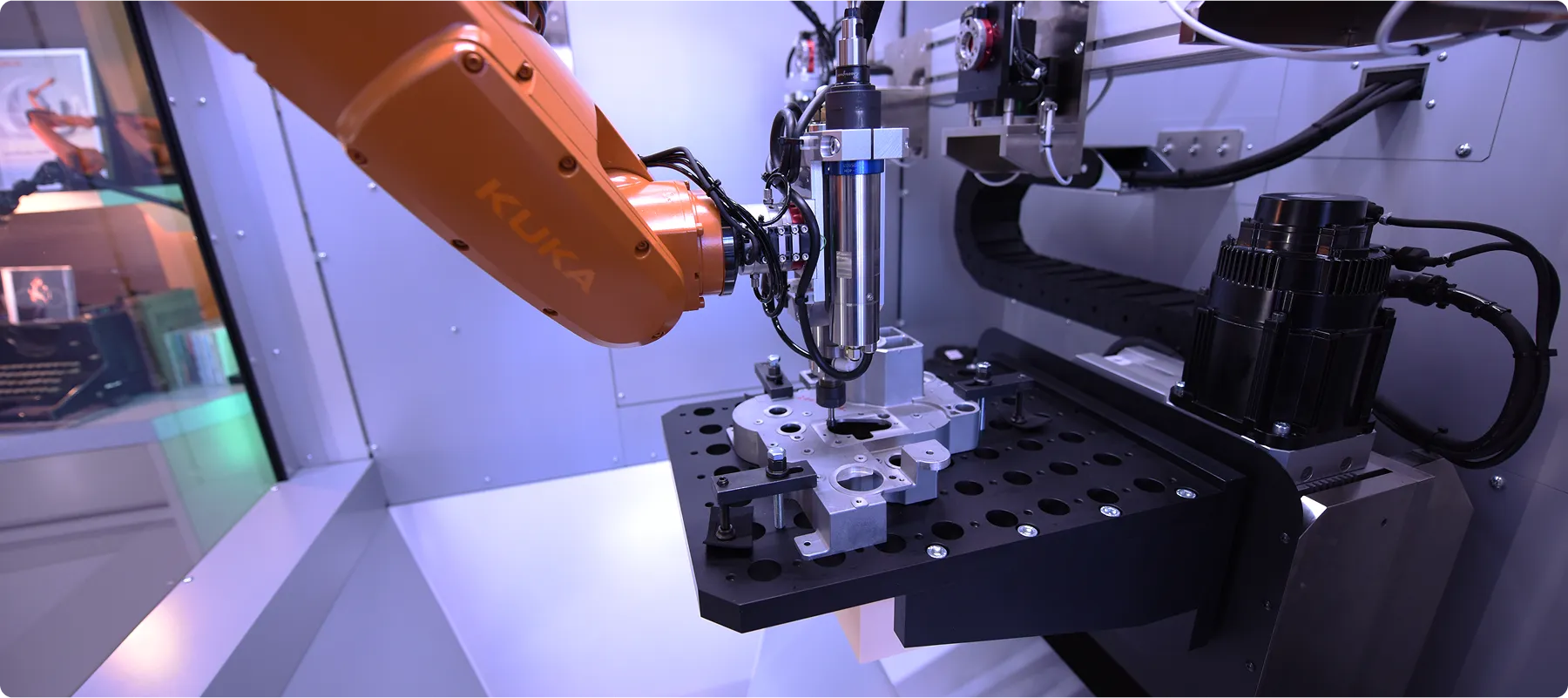 加工応力に耐える力強い剛性を持ち、耐久性にも優れているKUKAのロボットは、バリ取り・切削・研磨ほか加工において特に力を発揮します。